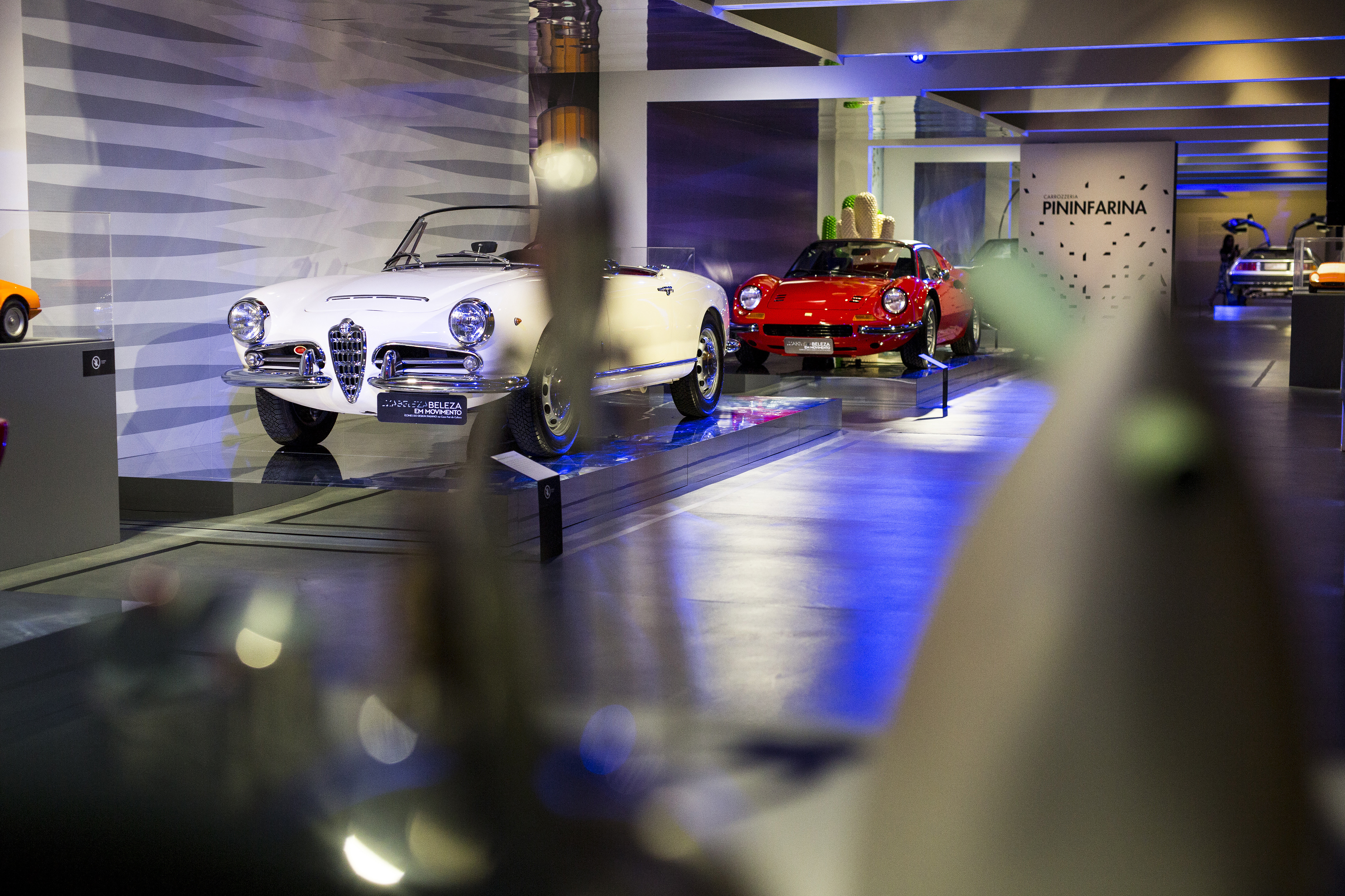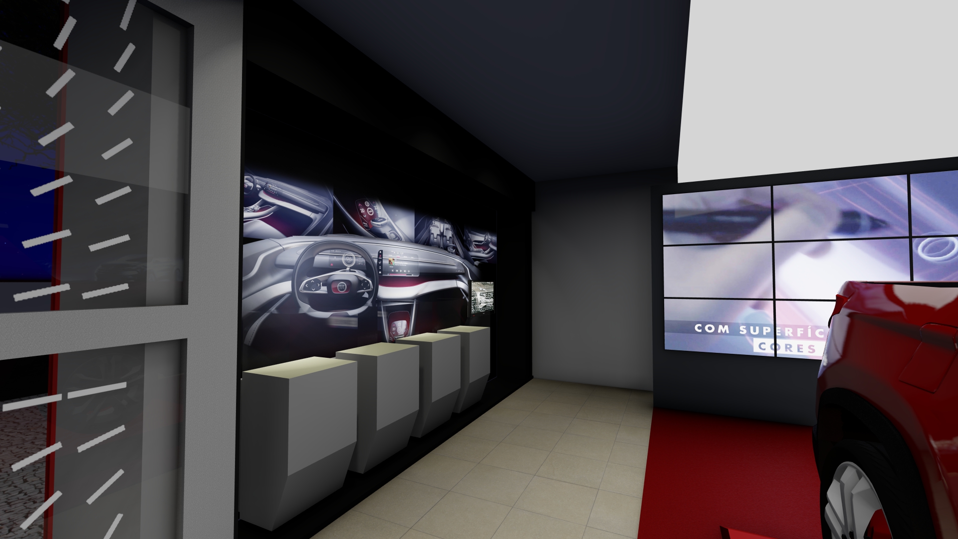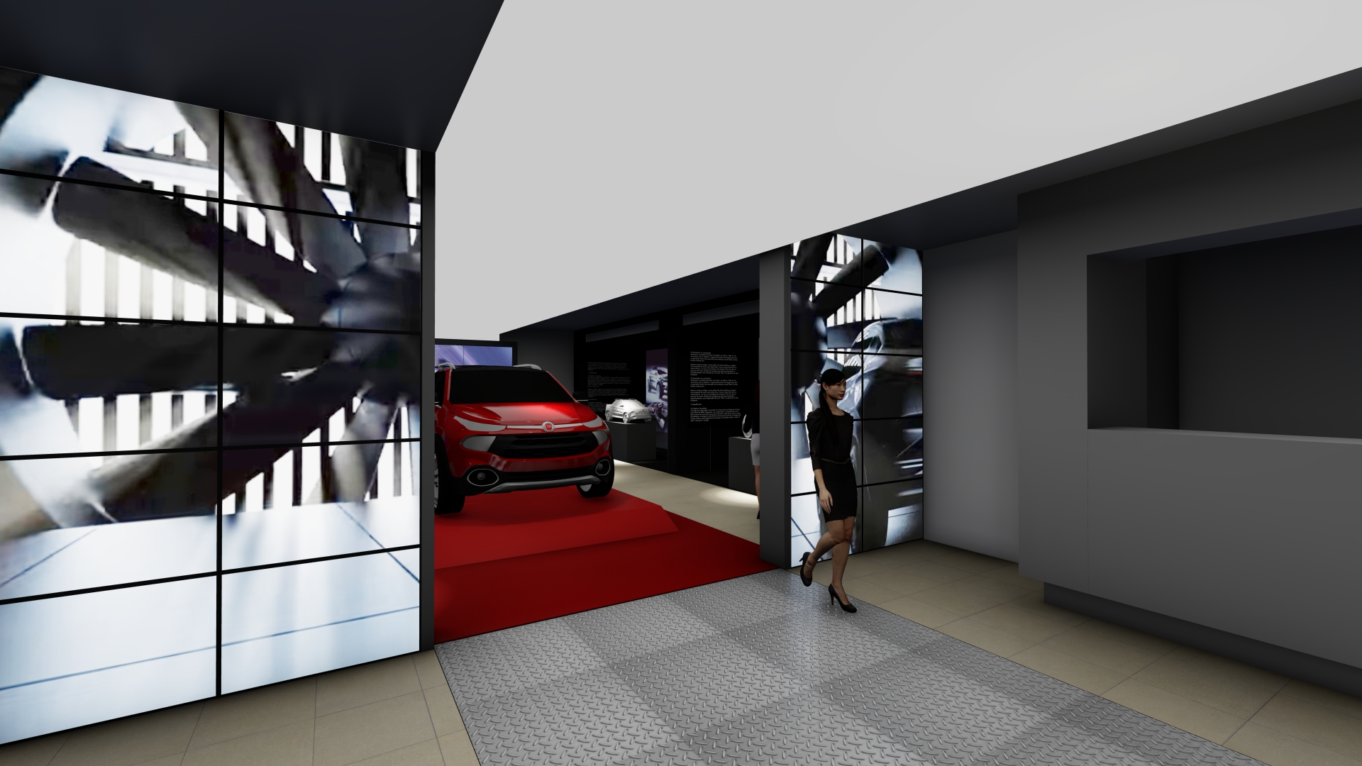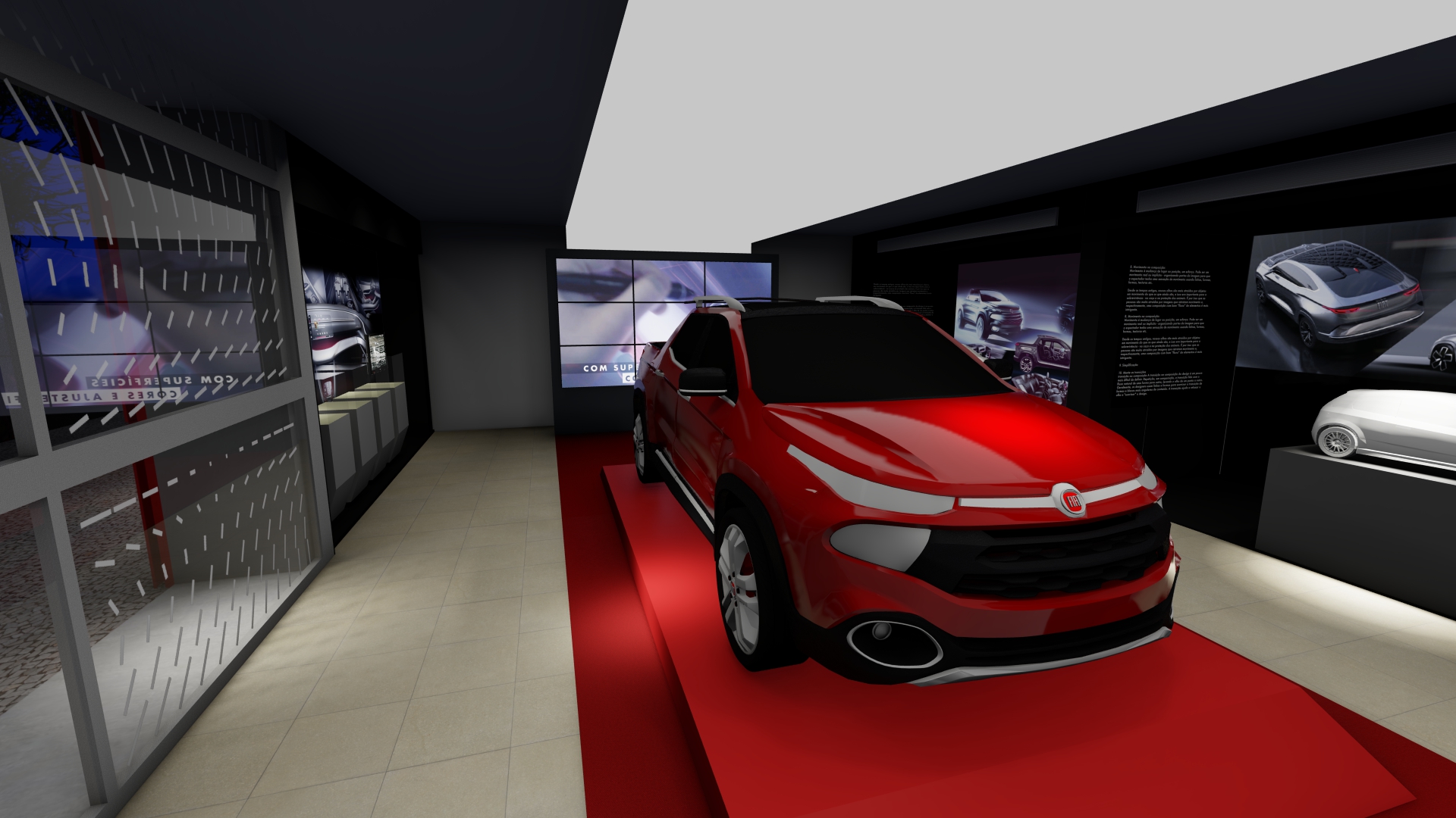 As galerias foram tratadas de forma fluida. Ao longo do espaço desenhamos pórticos de luz colorida e controlada – a luz produz um efeito análogo ao túnel de vento. Os carros se apresentam na sua plenitude refletindo as luzes em movimento. O piso e o teto de espelhos multiplicam o espaço e permitem múltiplos ângulos de visão.