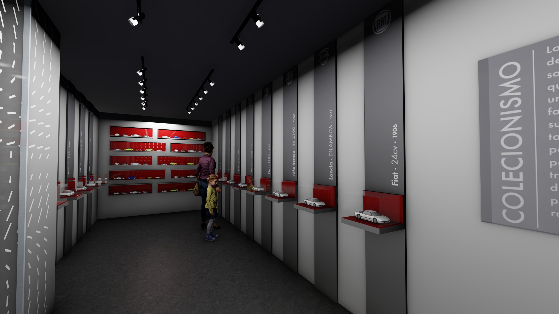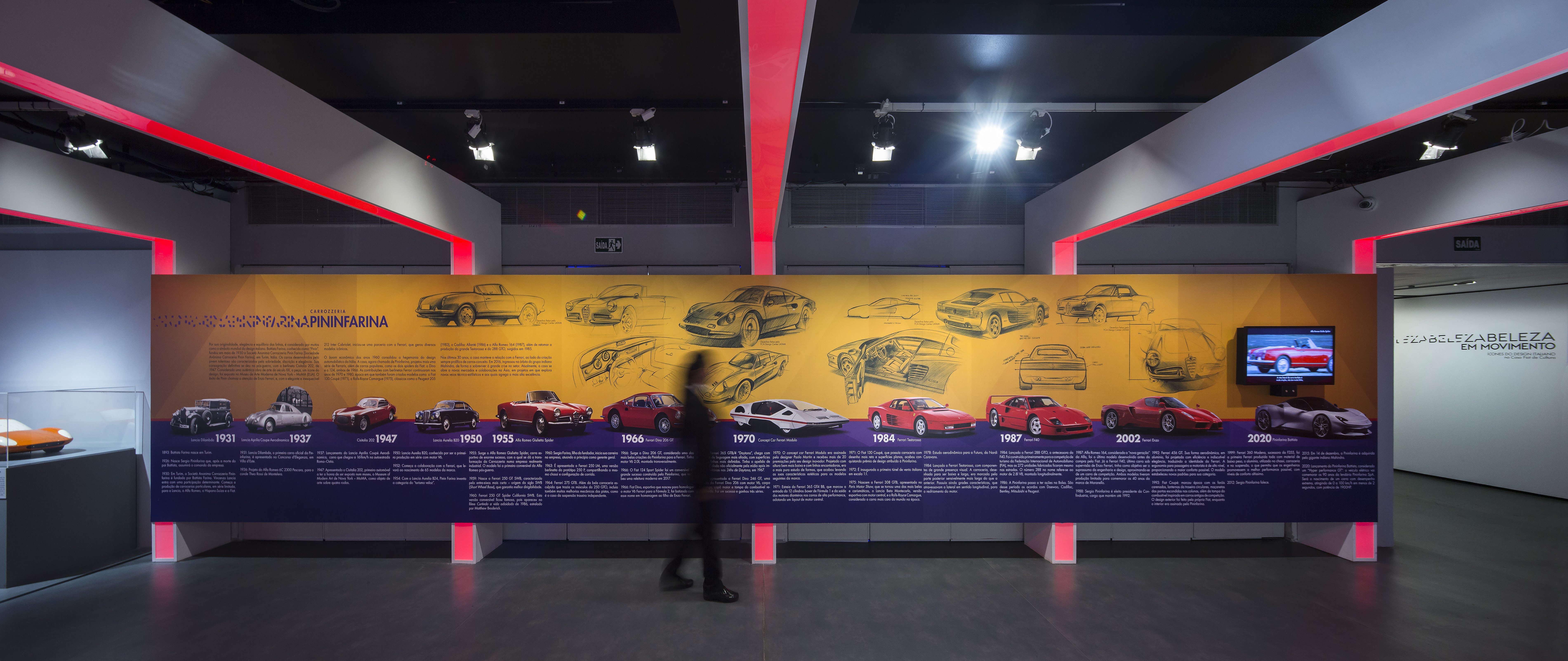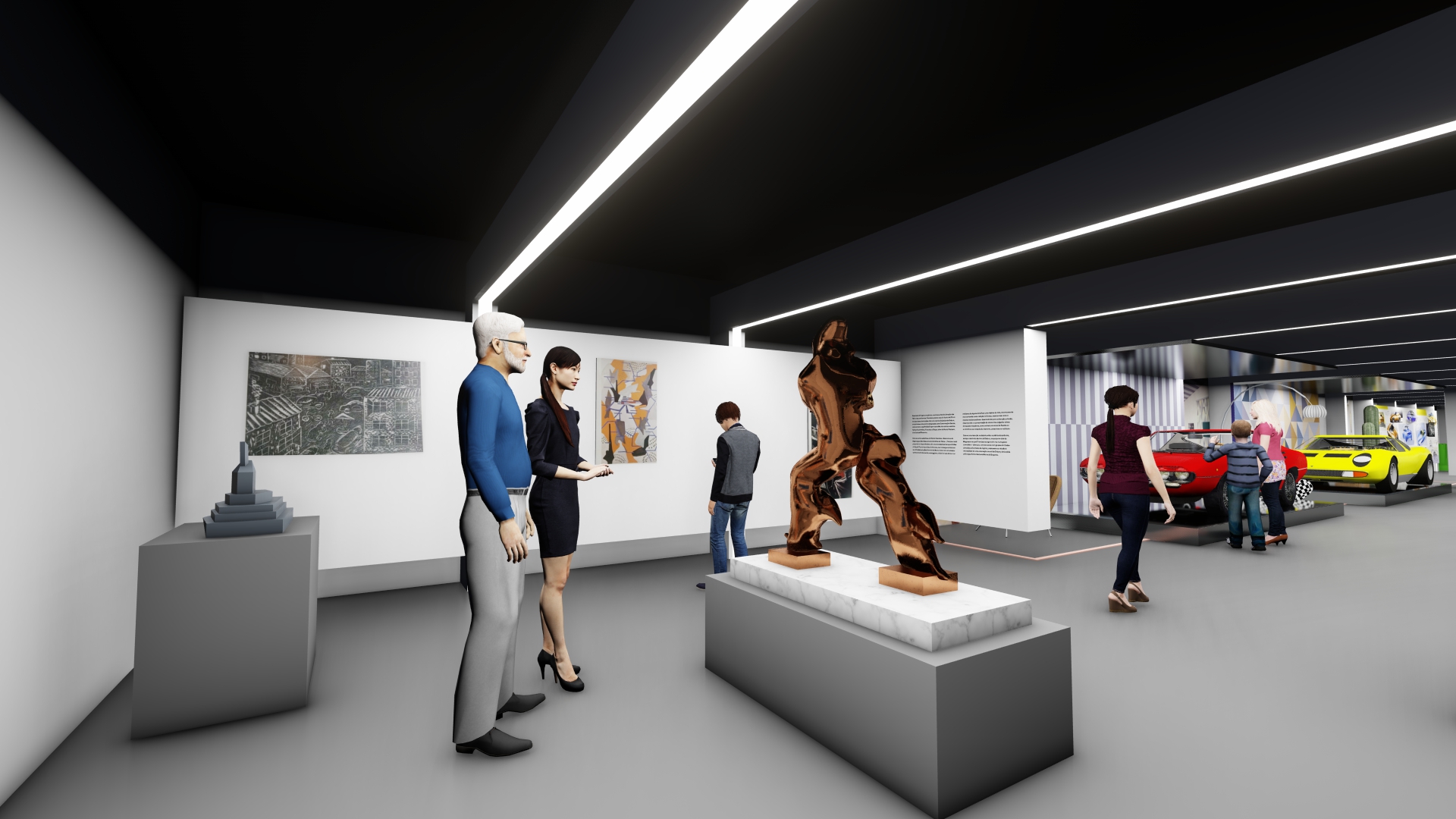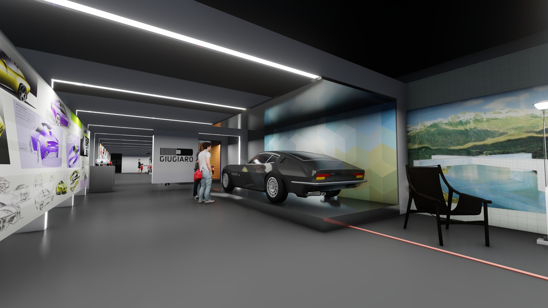 As galerias foram tratadas de forma fluida. Ao longo do espaço desenhamos pórticos de luz colorida e controlada – a luz produz um efeito análogo ao túnel de vento. Os carros se apresentam na sua plenitude refletindo as luzes em movimento. O piso e o teto de espelhos multiplicam o espaço e permitem múltiplos ângulos de visão.