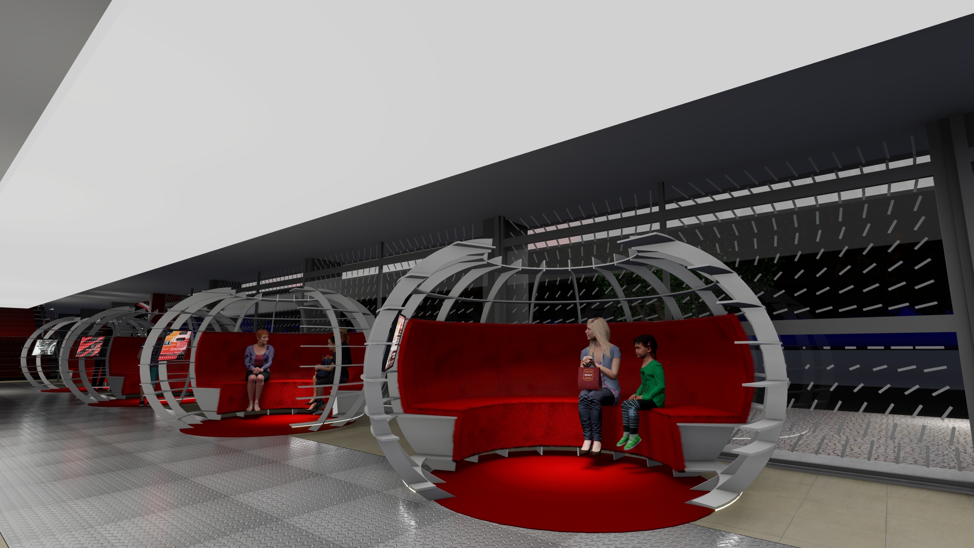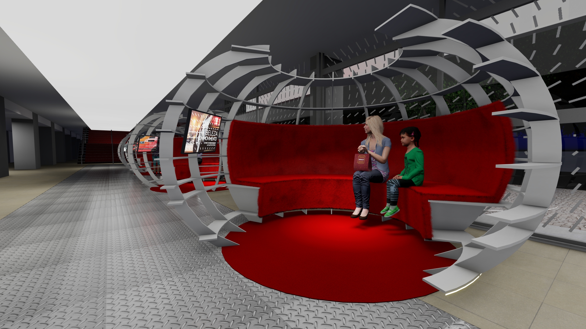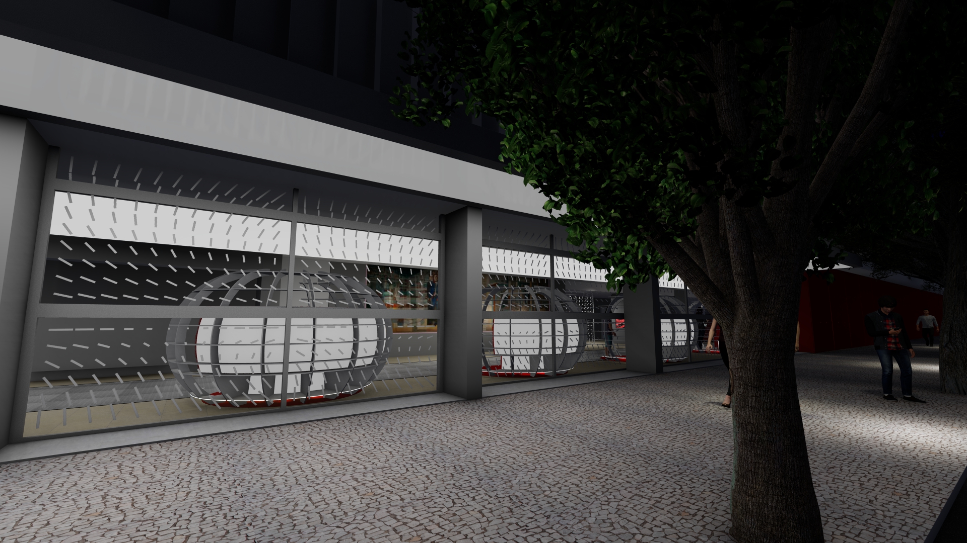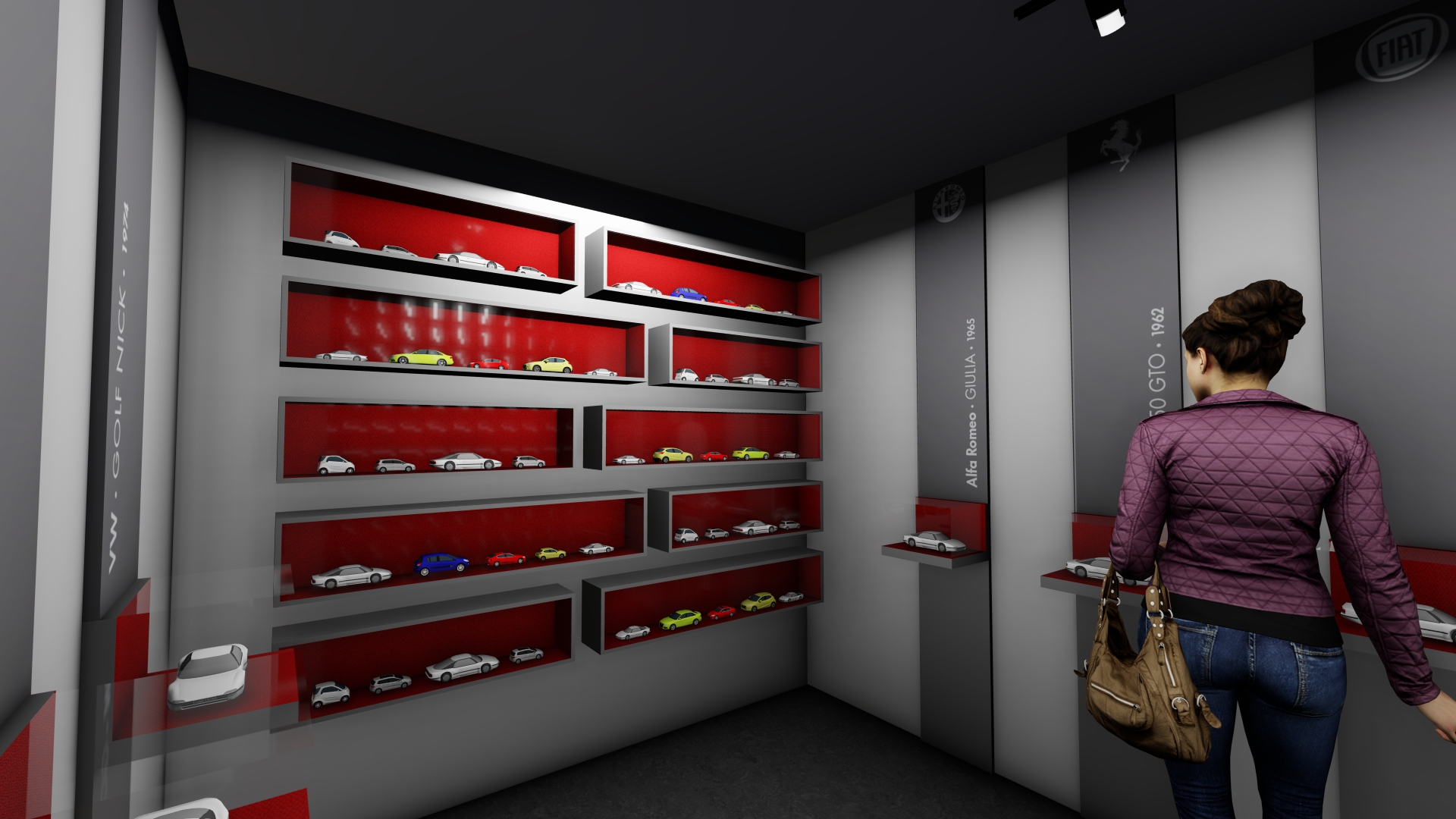 As galerias foram tratadas de forma fluida. Ao longo do espaço desenhamos pórticos de luz colorida e controlada – a luz produz um efeito análogo ao túnel de vento. Os carros se apresentam na sua plenitude refletindo as luzes em movimento. O piso e o teto de espelhos multiplicam o espaço e permitem múltiplos ângulos de visão.