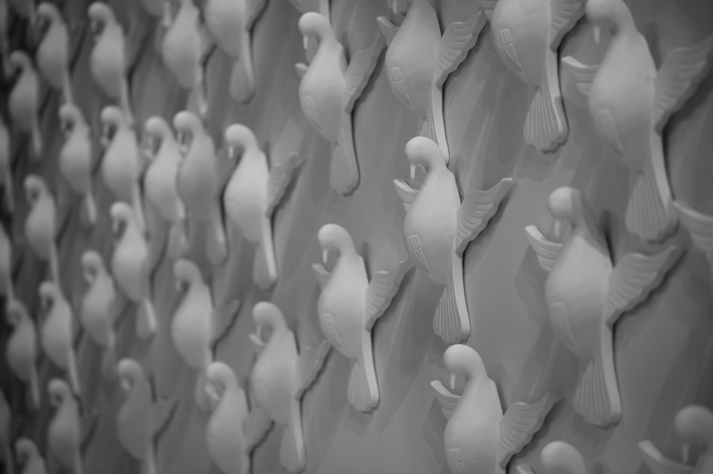 Detalhe dos pombos de gesso na boca de cena