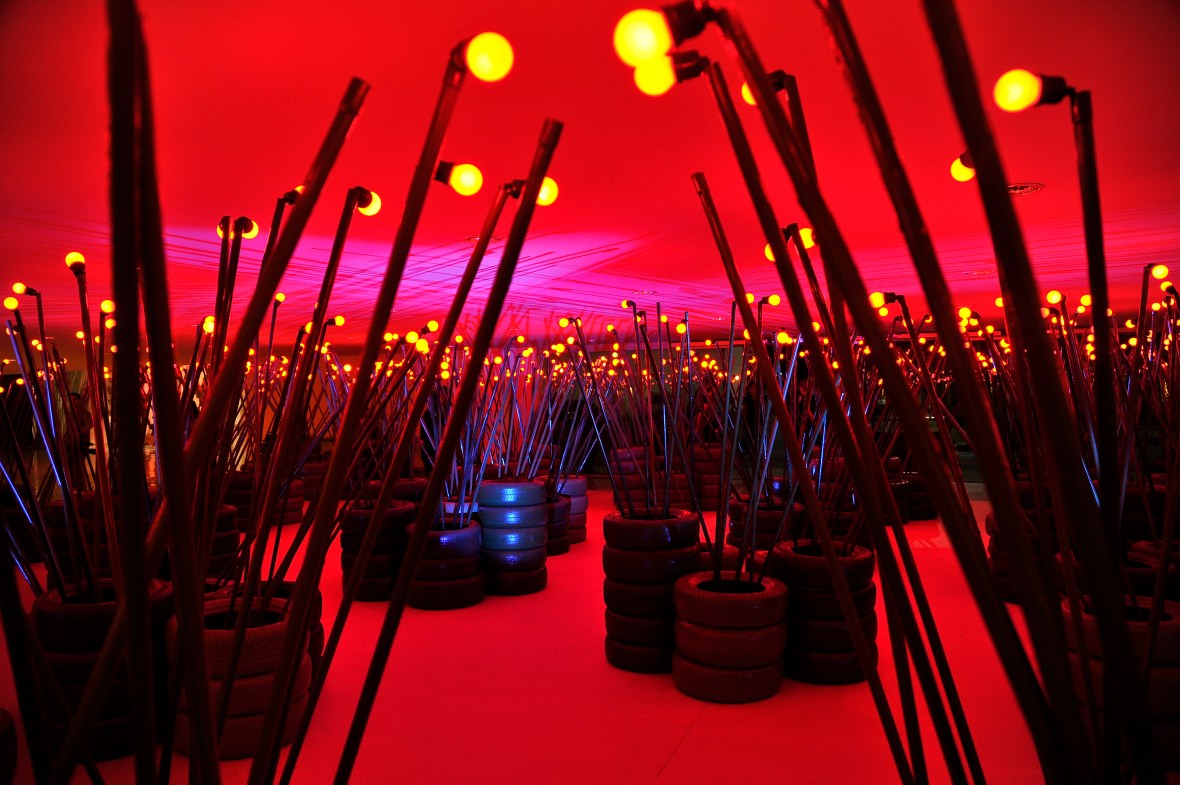 Floresta de pneus e lampadas no hall de entrada.