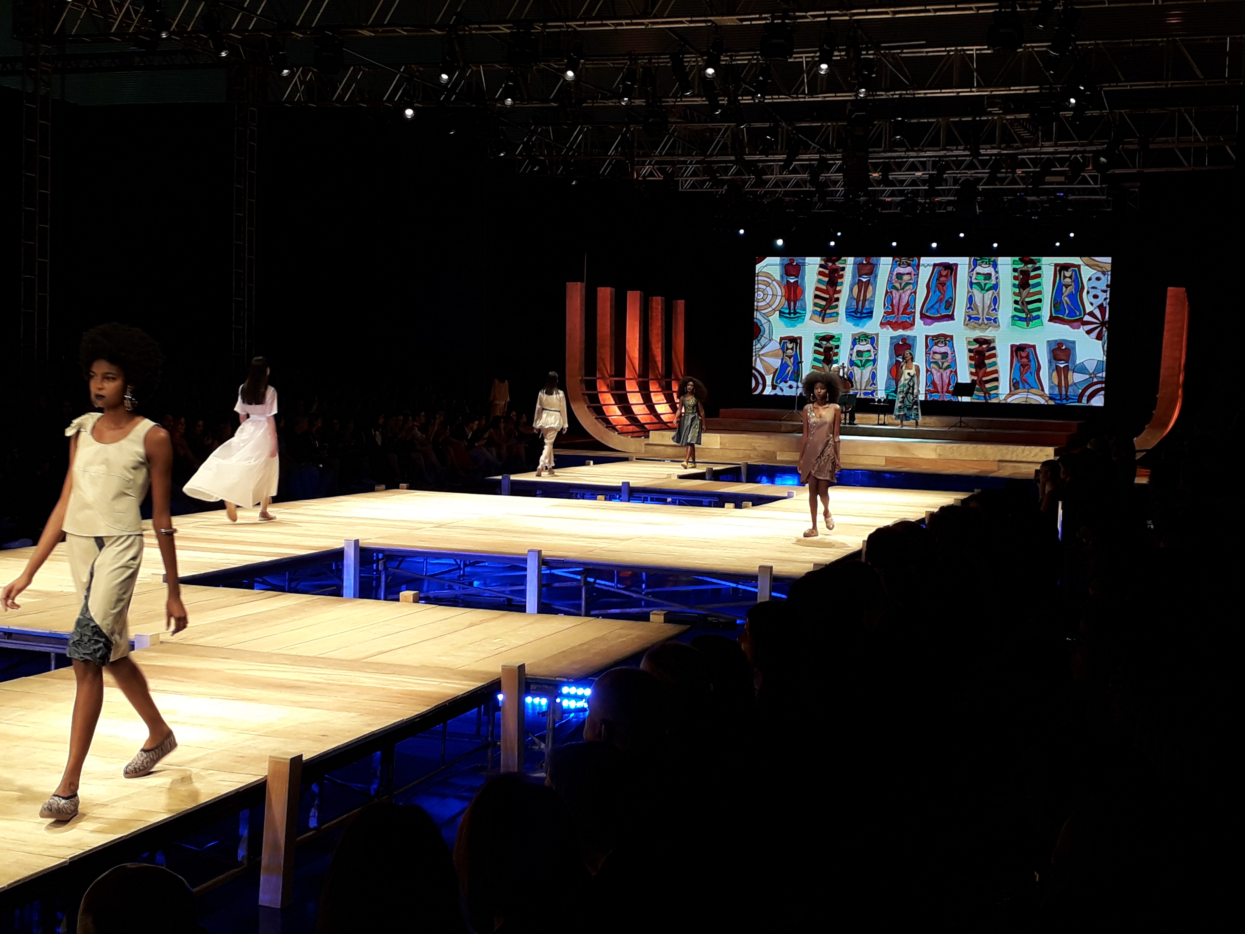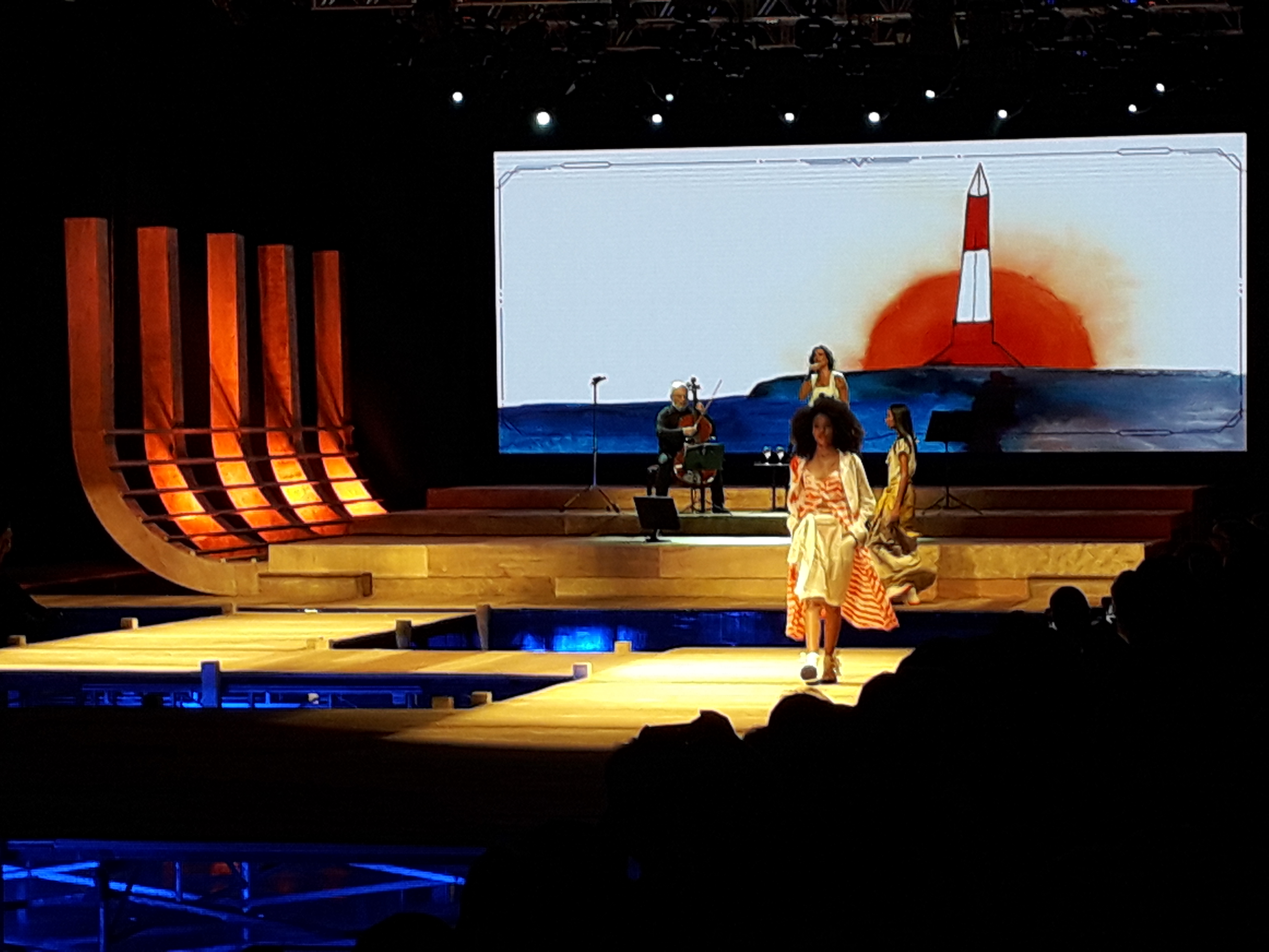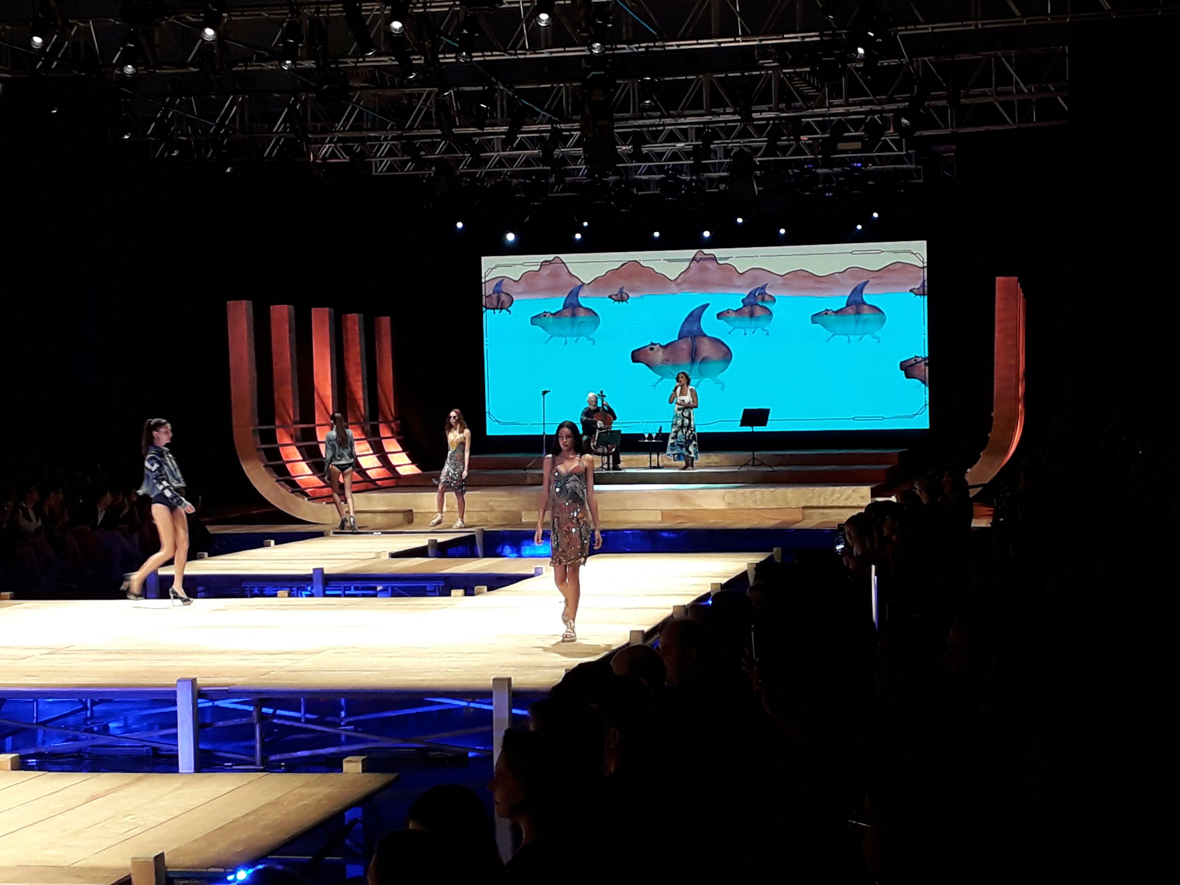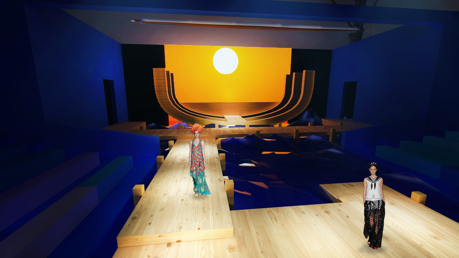 A passarela, evocava um cais de porto que serpenteava sobre um azul intenso maritmo – ao fundo da cena, o esqueleto de um barco que chegava ou partia.