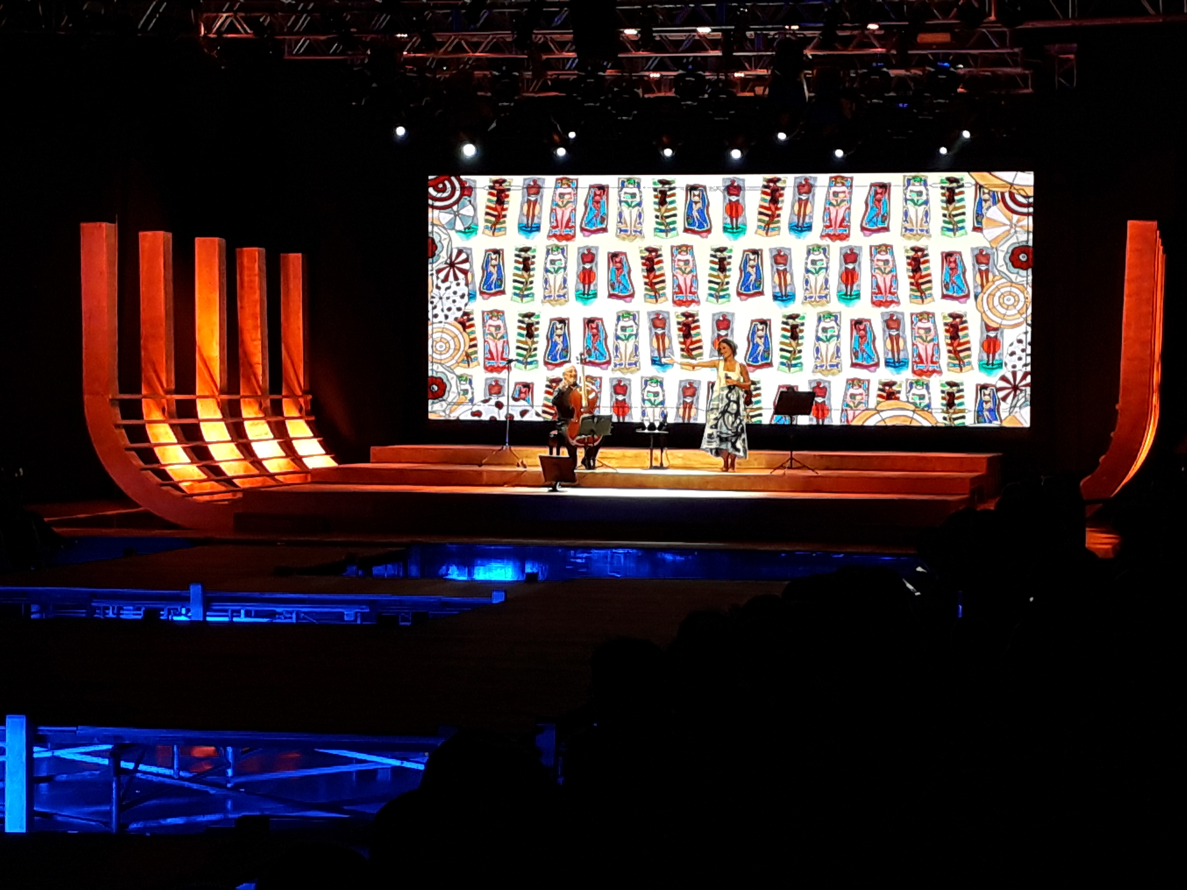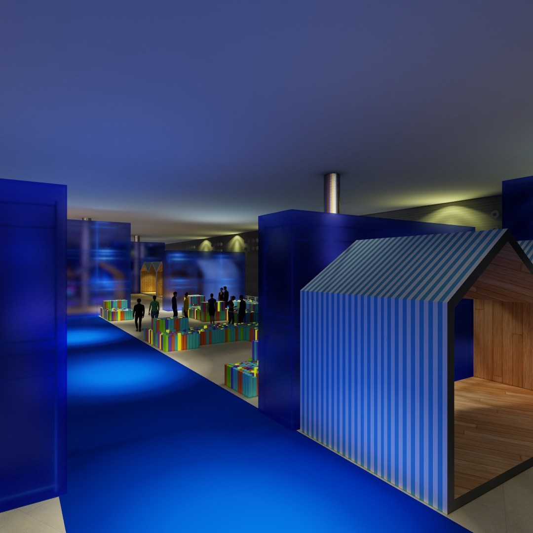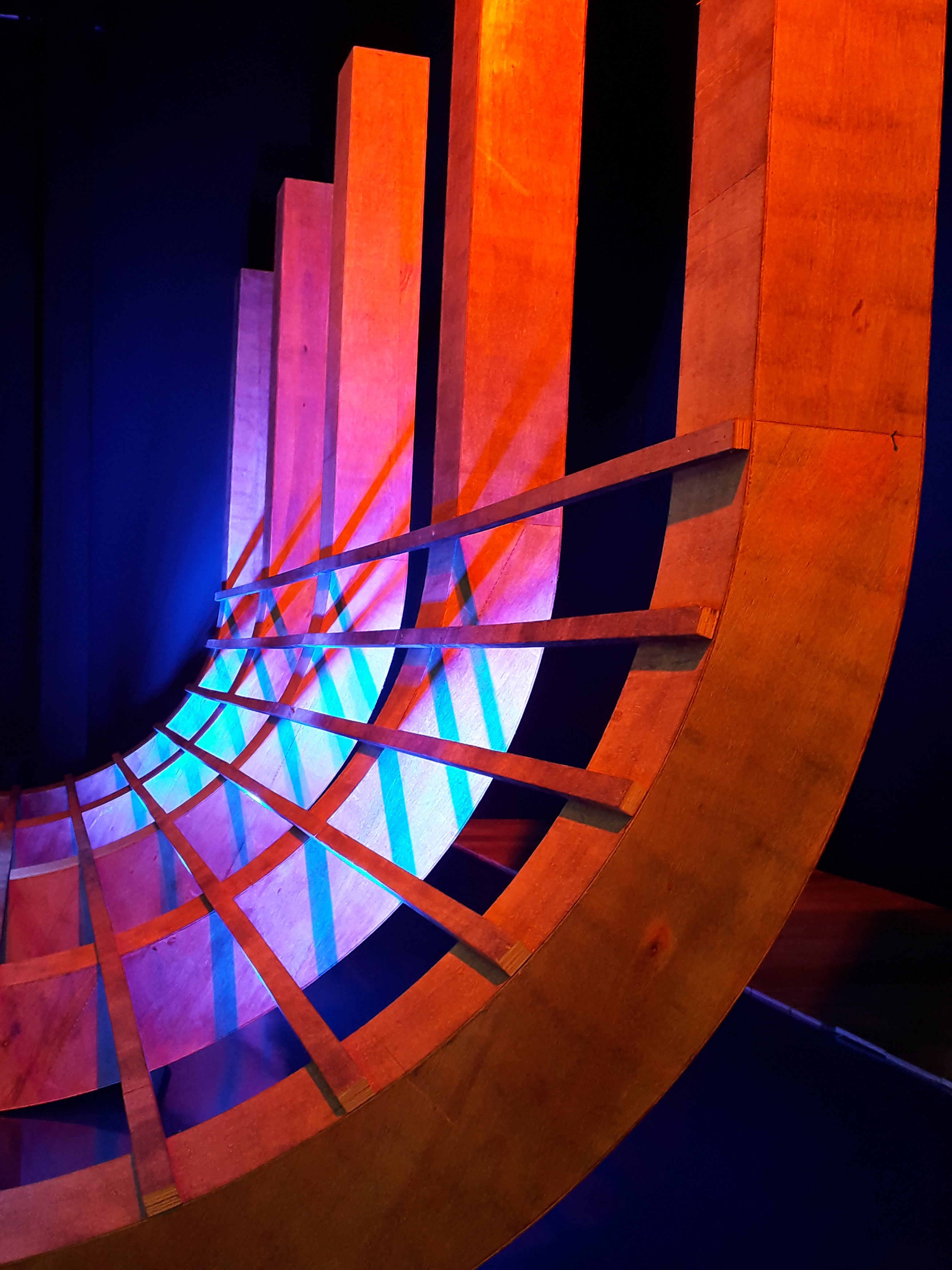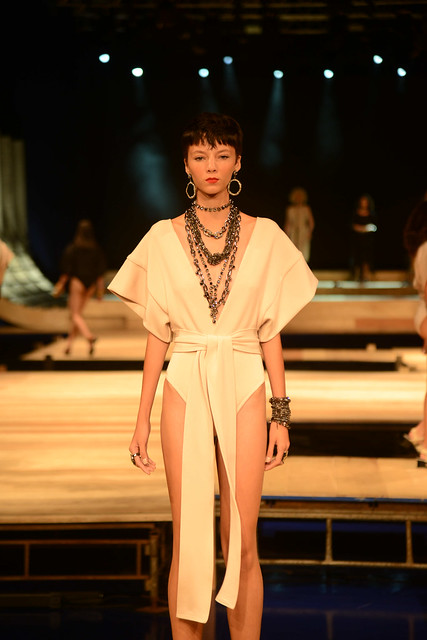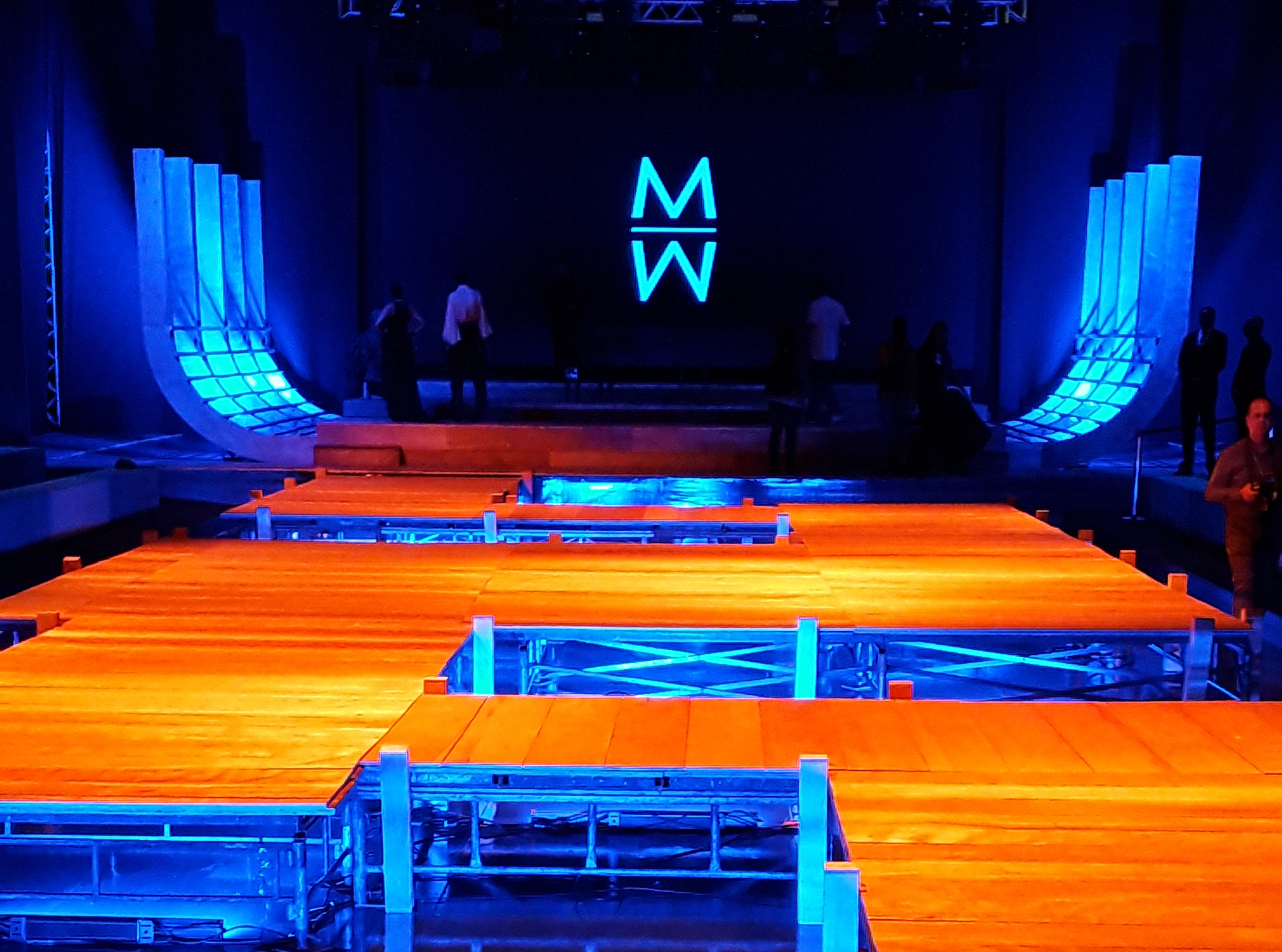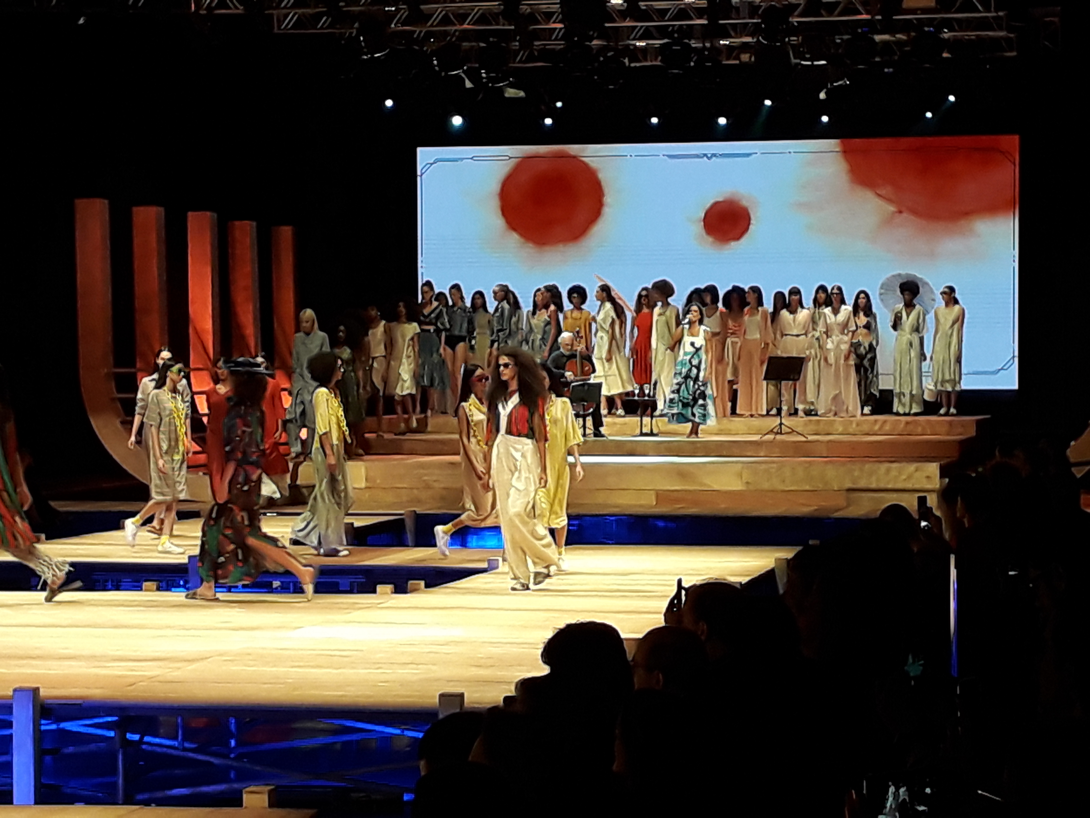 A passarela, evocava um cais de porto que serpenteava sobre um azul intenso maritmo – ao fundo da cena, o esqueleto de um barco que chegava ou partia.