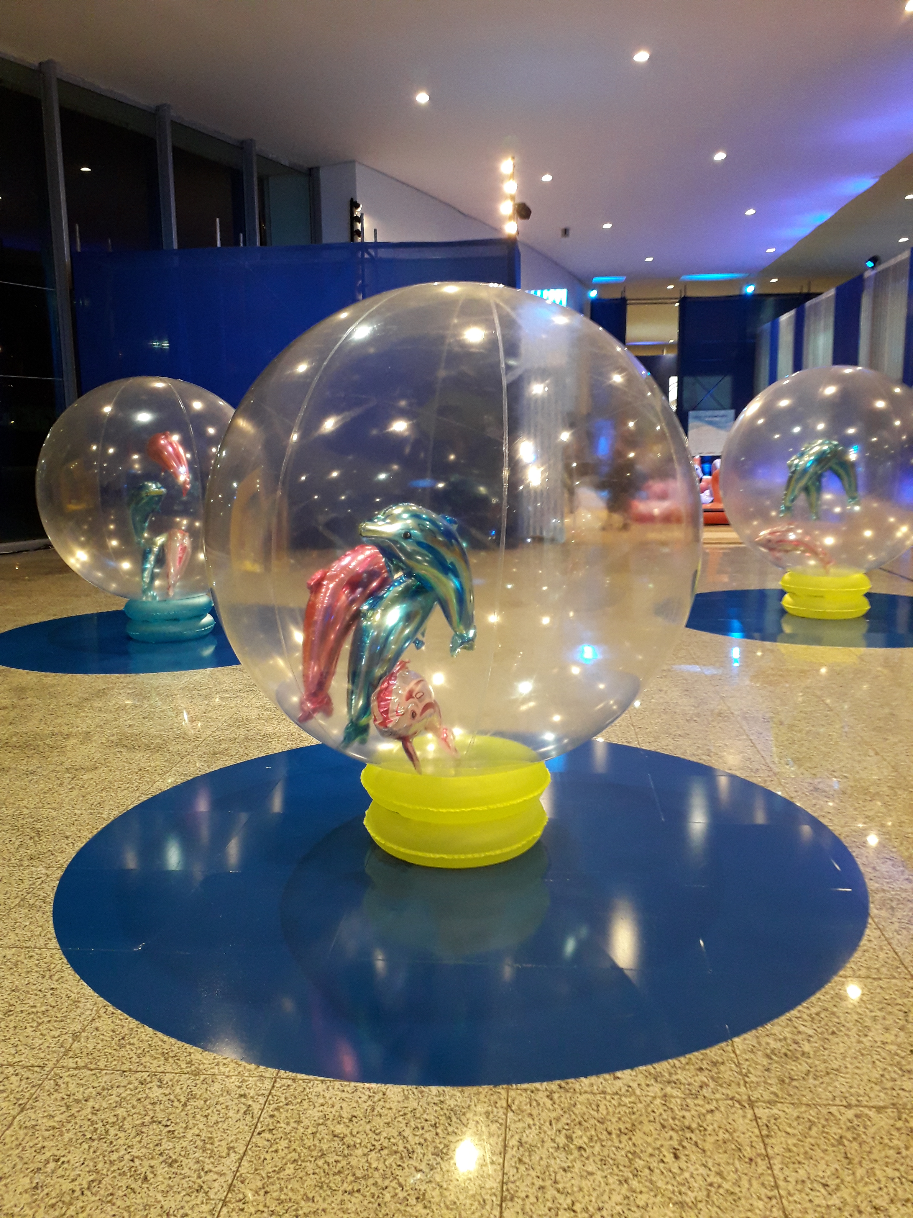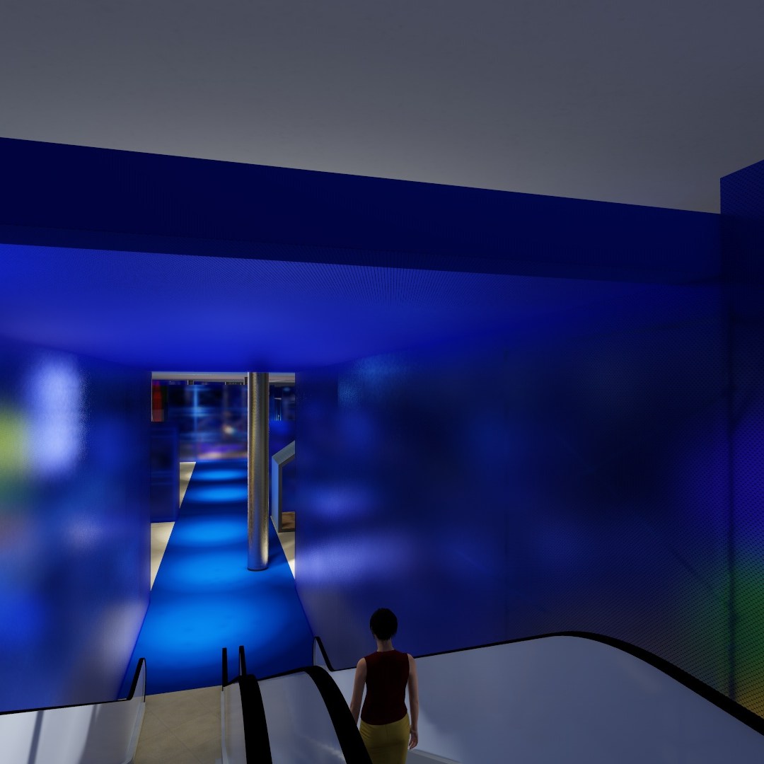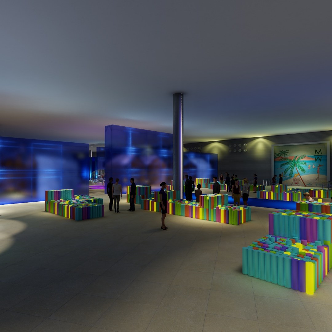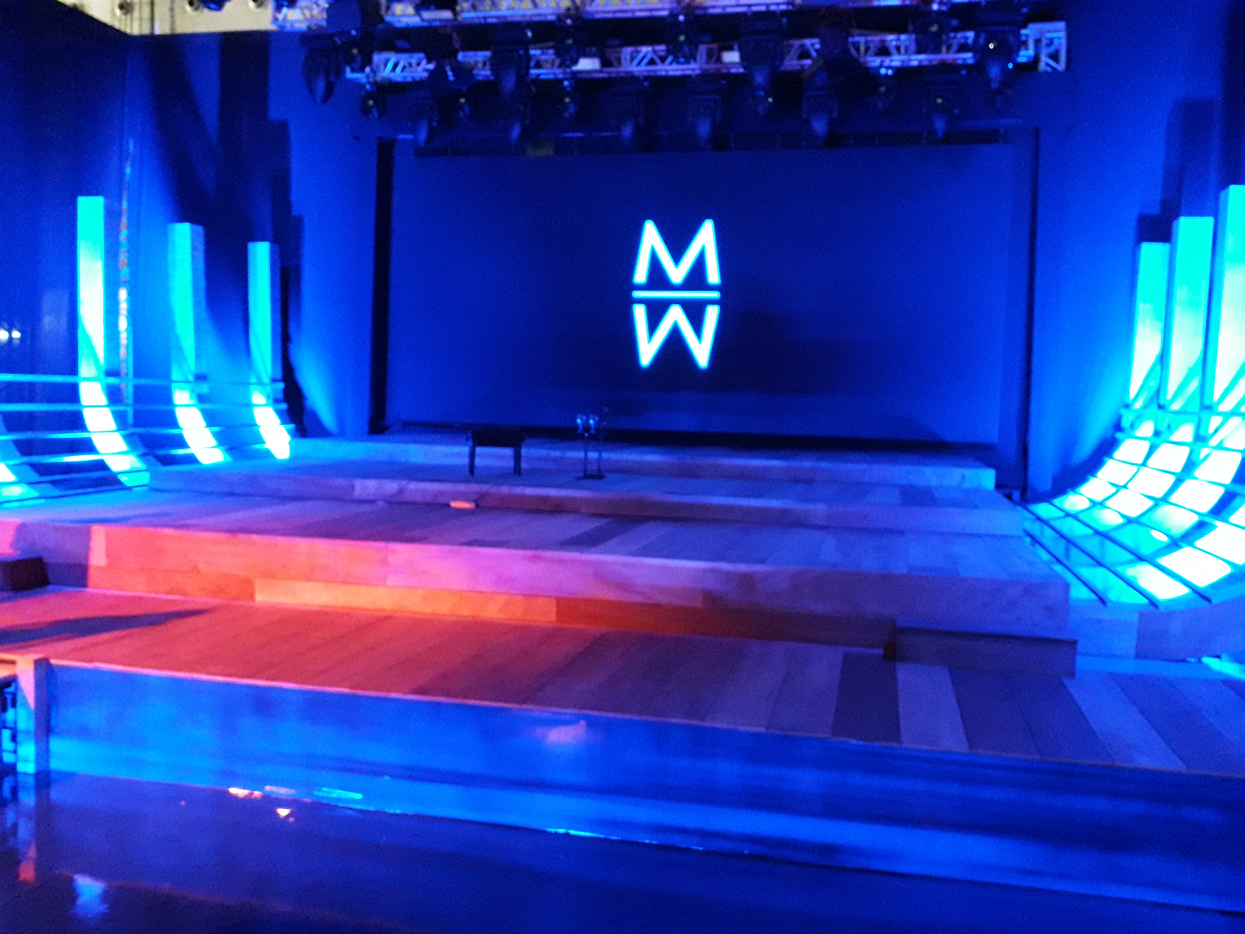 A passarela, evocava um cais de porto que serpenteava sobre um azul intenso maritmo – ao fundo da cena, o esqueleto de um barco que chegava ou partia.