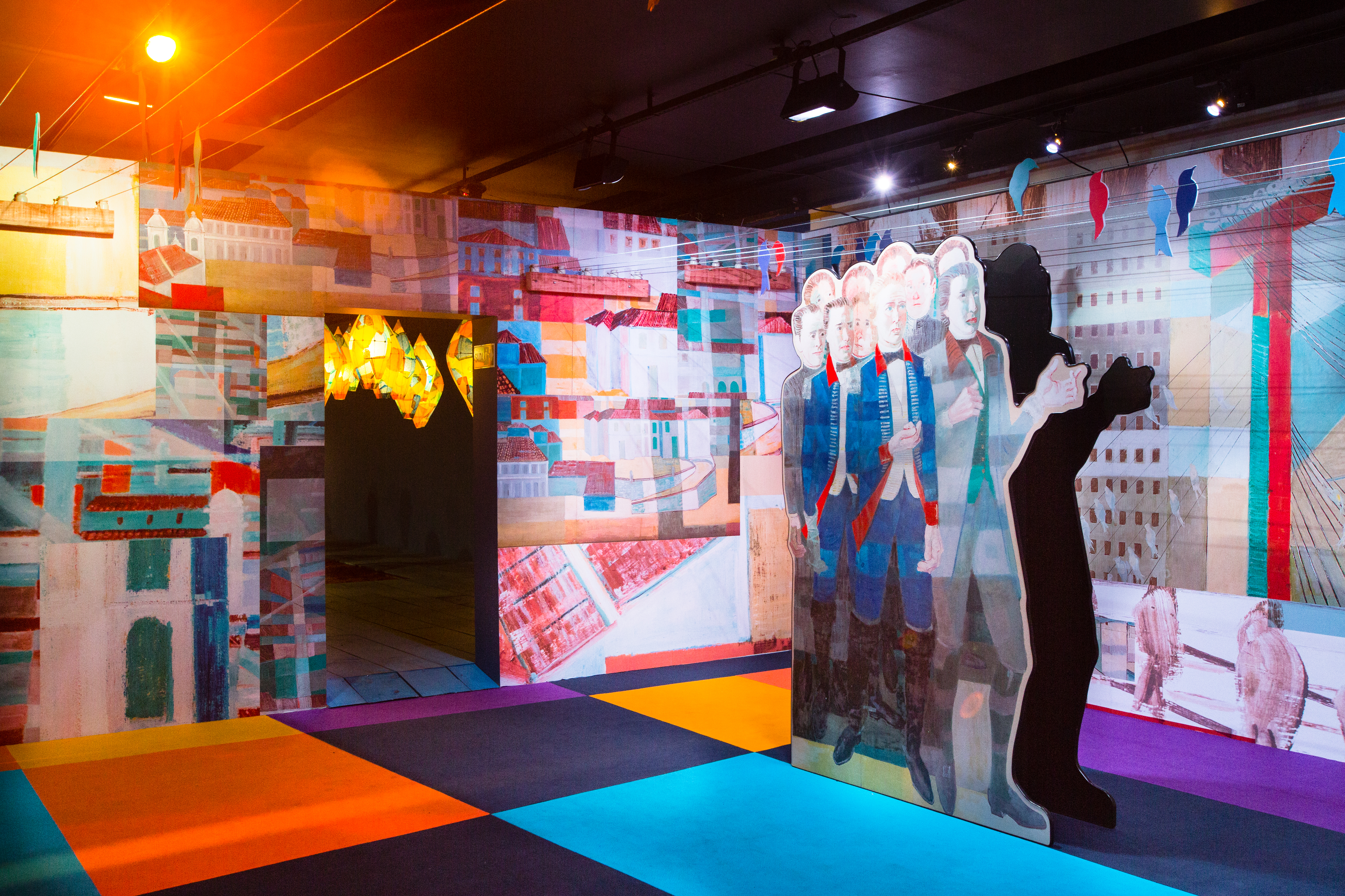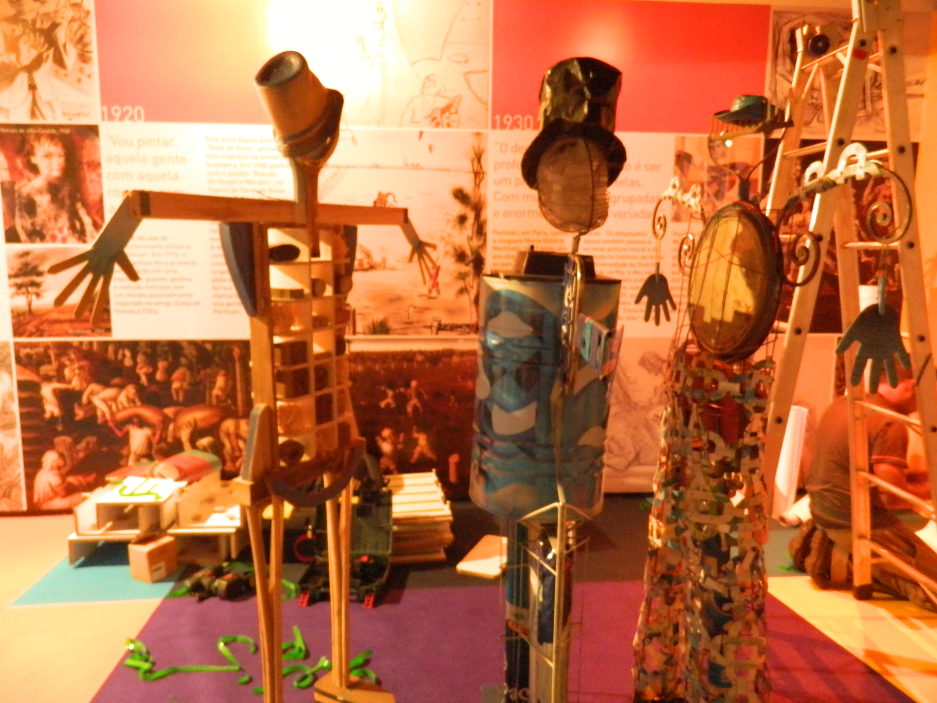 Nosso escritório produziu espaços inspirados nos trabalhos geométricos e tridimencionais da obra de Portinari, assim como elementos poéticos recorrentes em sua obra. Produzimos experiências sensoriais, com os balões, espantalhos, café e os pássaros na rede elétrica presentes no mural restaurado.